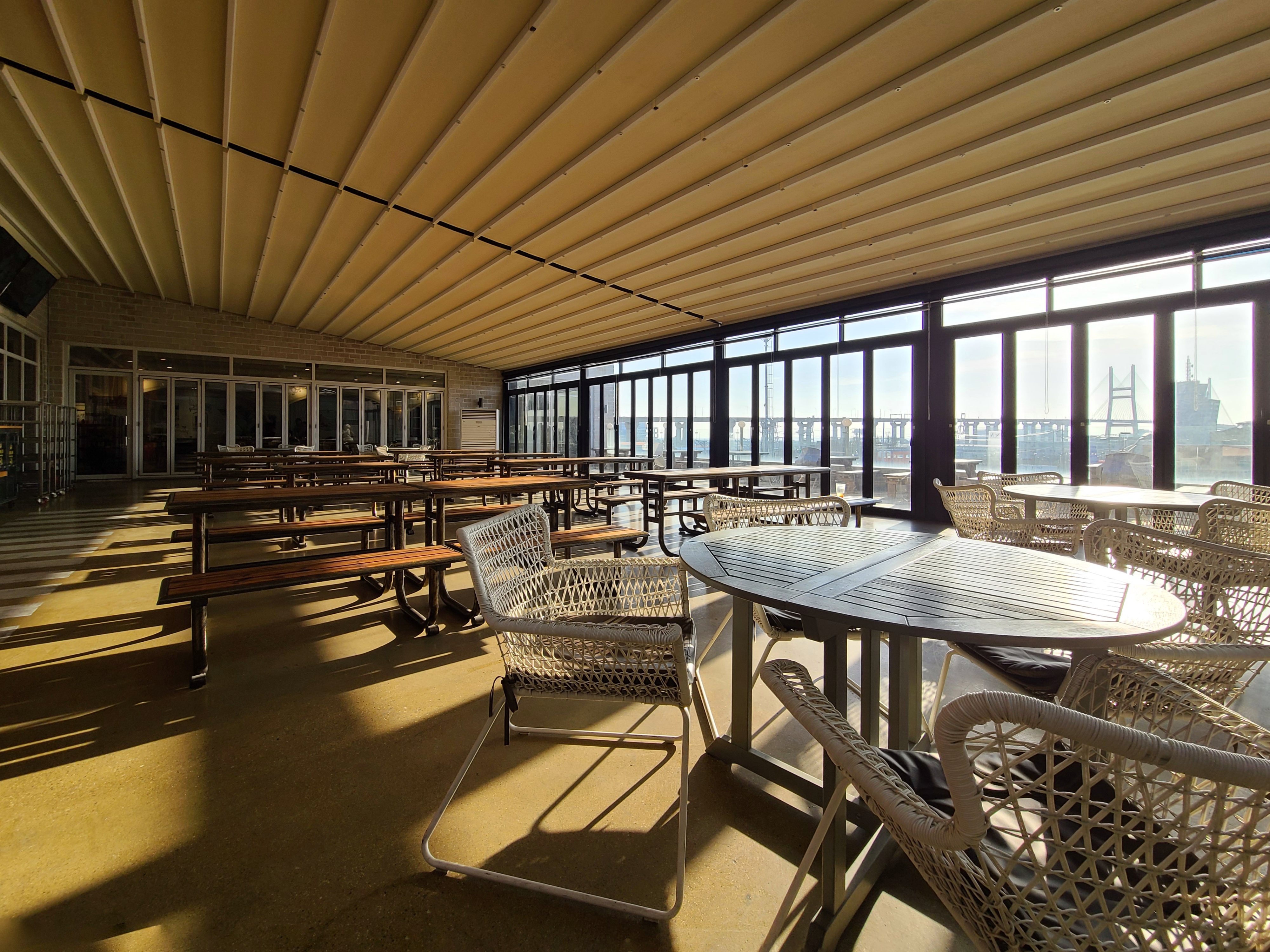 창 너머로 서해대교가 훤히 내다 보이는 main street 대형 베이커리 까페 본점, 2023년에 처음 들어가보고 그 규모와 인테리어에 놀랬었다. 미국 뉴욕 감성이 가득한 까페를 옮겨다 놓은 것처럼 바다를 건너 온 인테리어 물품들로 가득하다.가끔 그길을 지나게 될 때 아내와 함께 들러 빵 몇 조각과 까페라떼 한 잔 마시고 가는 곳. 한적하게 구획된 곳에 테이블이 정갈하게 놓여있다.