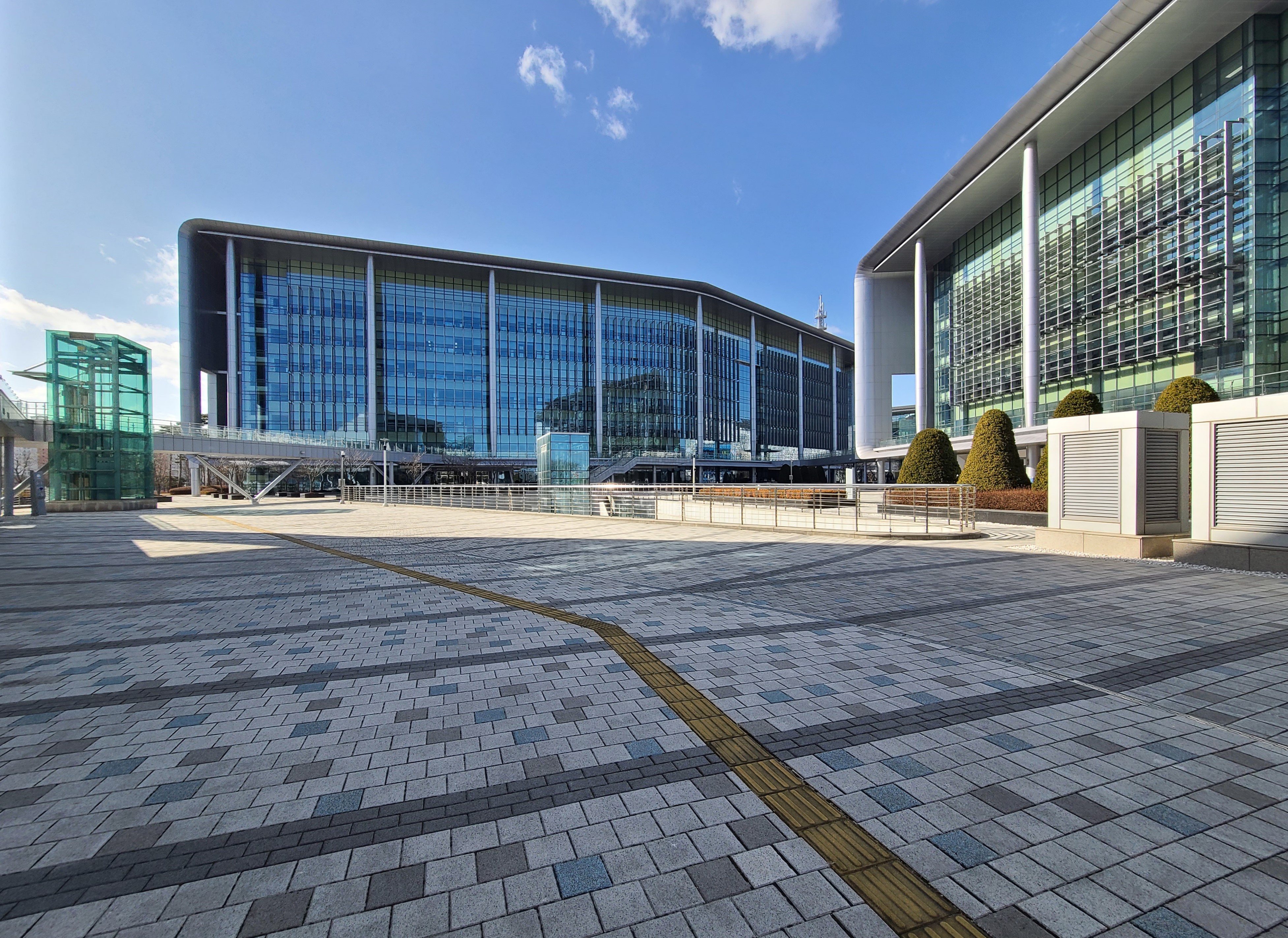 건축물을 떠받치고 있는 철강 원형 기둥, 벽체 전체의 마감 재료인 유리, "형태와 디자인은 기능에 의해 결정되어야 한다" 현대 건축의 기능주의에 부합되는 실용성이 강조된  관공서 건축물이다.