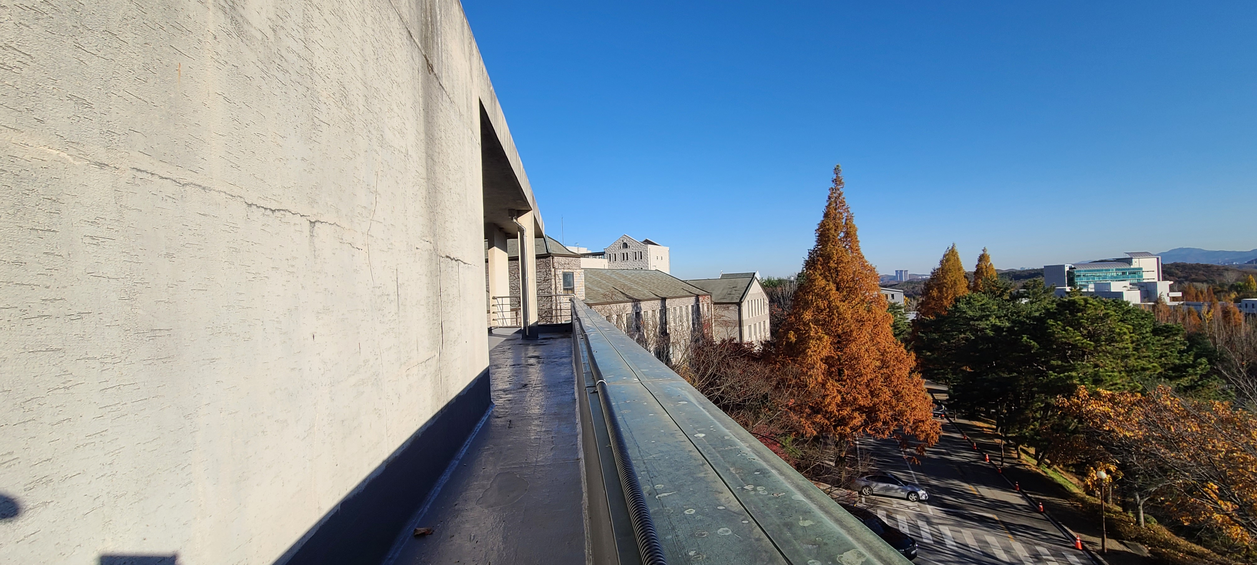 수목들이 붉게 물든 가을의 어느 길목에서 또 다른 건물을 향해 화살표처럼 이어지는 듯한 옥상의 난간대를 옆에 놓고 건물에서 건물로 이어지는 유럽풍의 건축물들을 바라본다.