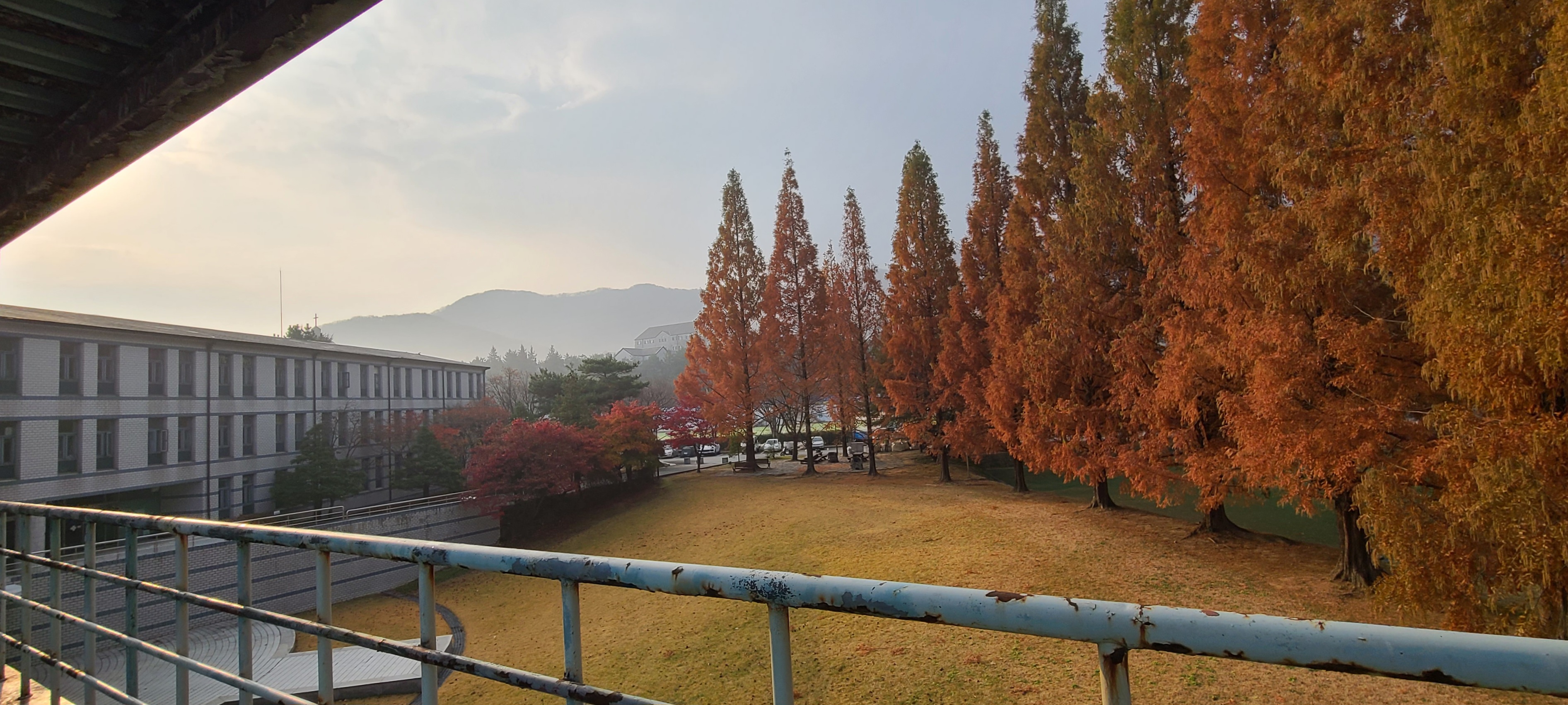깊어가는 가을, 아침 햇살을 받으며 붉고도 깊게 물들어 가는 메타세콰이어를 바라보는 건축물은 행복하기만하여라.