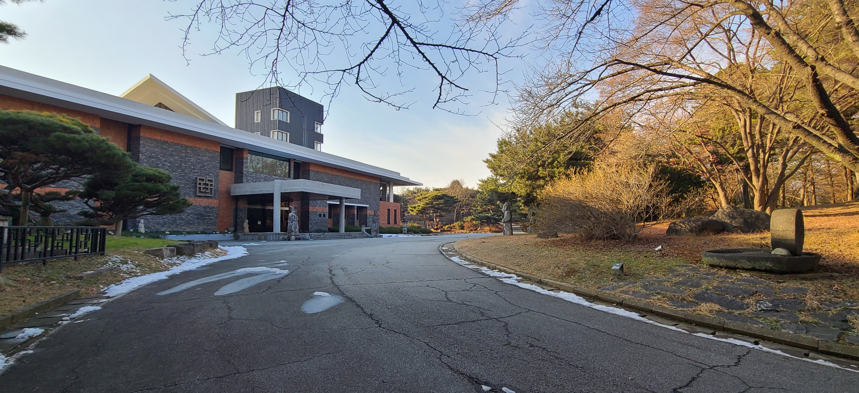 온양민속박물관, 입장료를 내고 진입하여 길을 따라 조금 걸어 가면 보이는 본관 풍경, 인간의 출생에서부터 유년기를 거쳐 청년기, 장년기, 노년기에 이르러 죽음에 이르기까지의 전 과정을 전시해 놓고 관람자들의 삶을 뒤돌아 보게 만든다. 문명이 싹트기 전 어른들의 생업이었던 농업,어업,수렵에 의존하면서 삶을 유지해왔던 성년들의 생활상을 실감나게 제작해 전시해 놓았다.