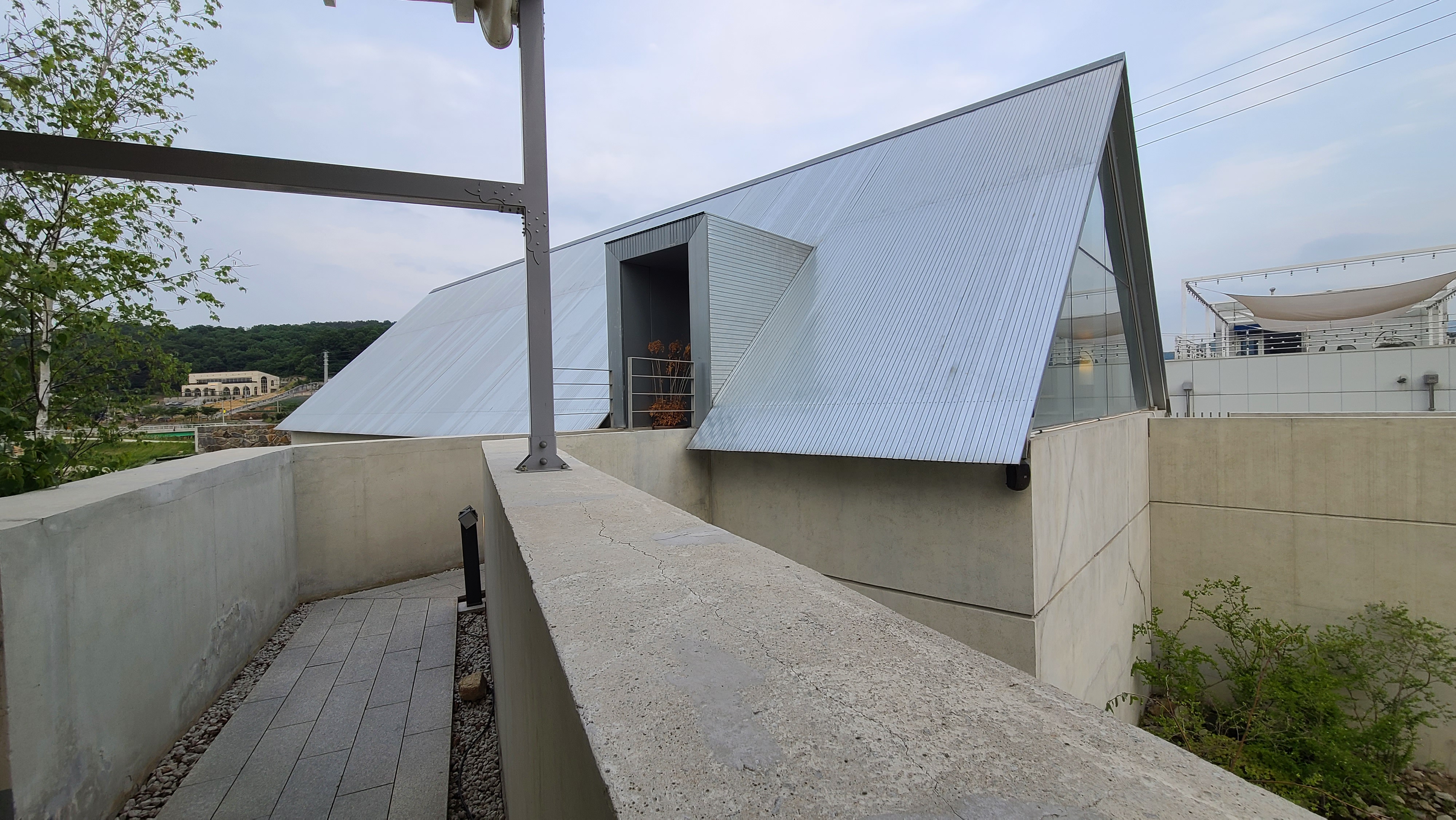 박공형 양철 지붕에 돌출 직사각형 출구를 내서 또 다른 공간으로 이어지는 소통의 길을 냈다.