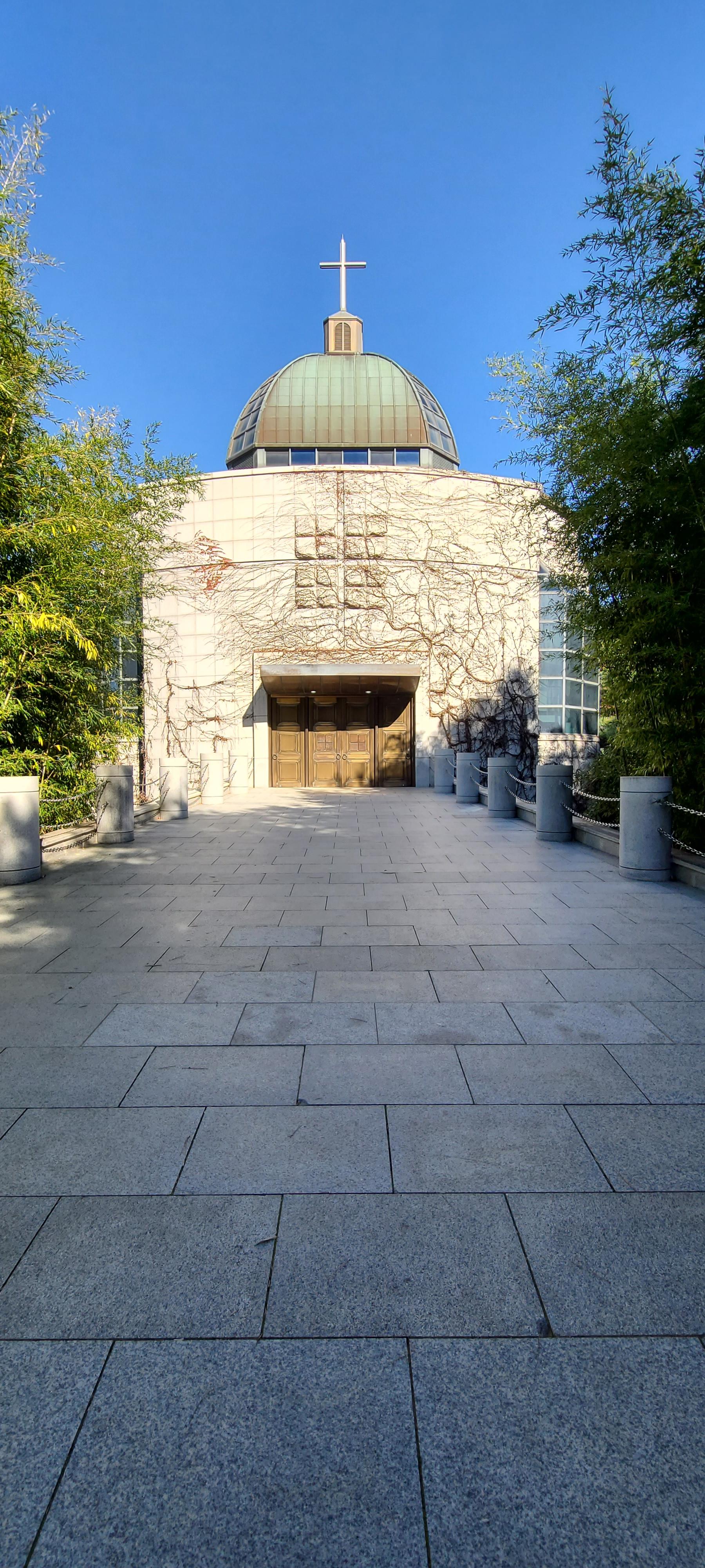 순광이라서 빛이 아쉽기만 하지만 교회 건축물의 분위기는 참 좋게 느껴진다. 담쟁이 덩쿨로 입혀진 대리석 벽과 좌우에 늘어선 대나무들이 건축물의 운치를 높여주고 있다.