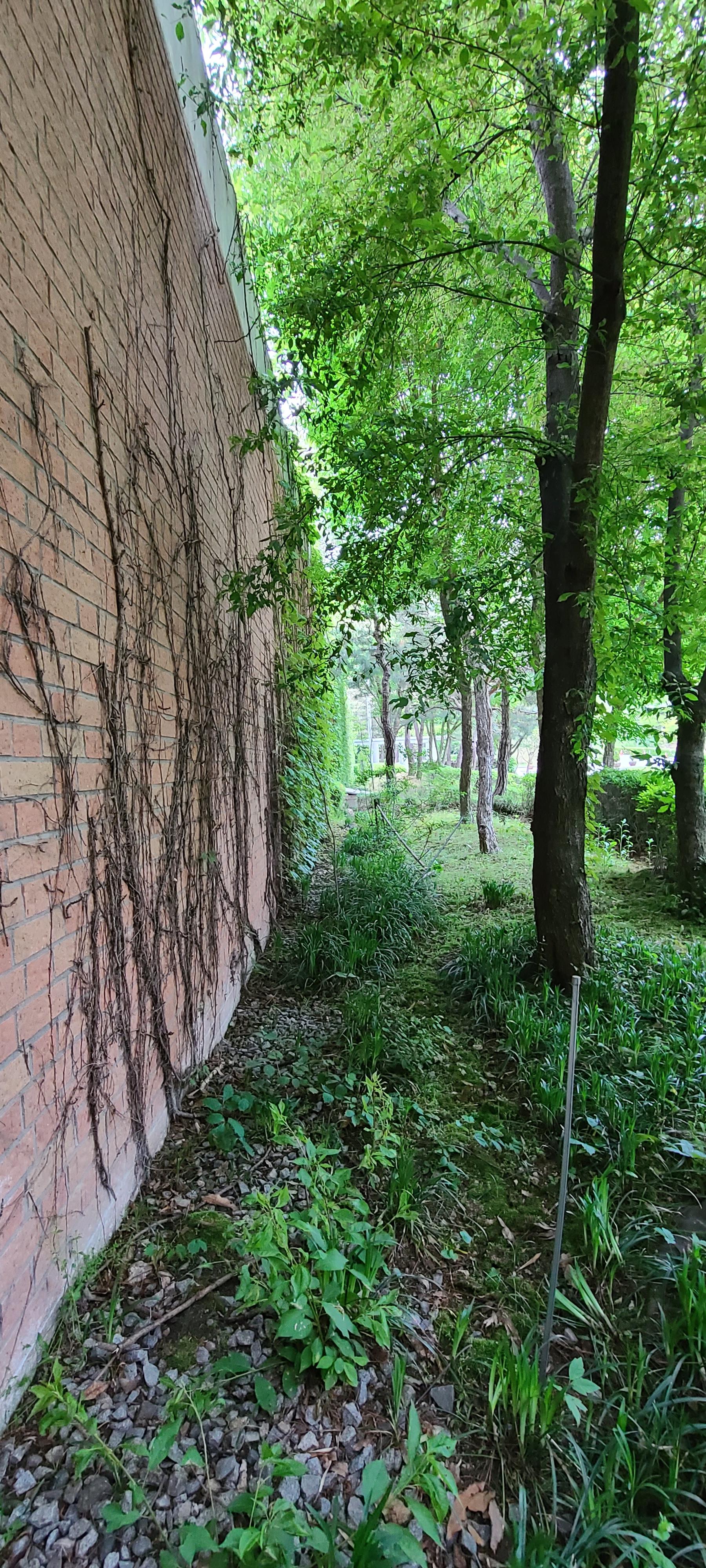 빨간 벽돌 건물의 외벽에 담쟁이 덩쿨이 낙엽을 모두 떨군채로 앙상하게 붙어있고 대조적으로 그 바로 앞에는 녹색의 식물과 나무들이 줄지어 서있어서 오월의 푸르름이 돋보인다.
