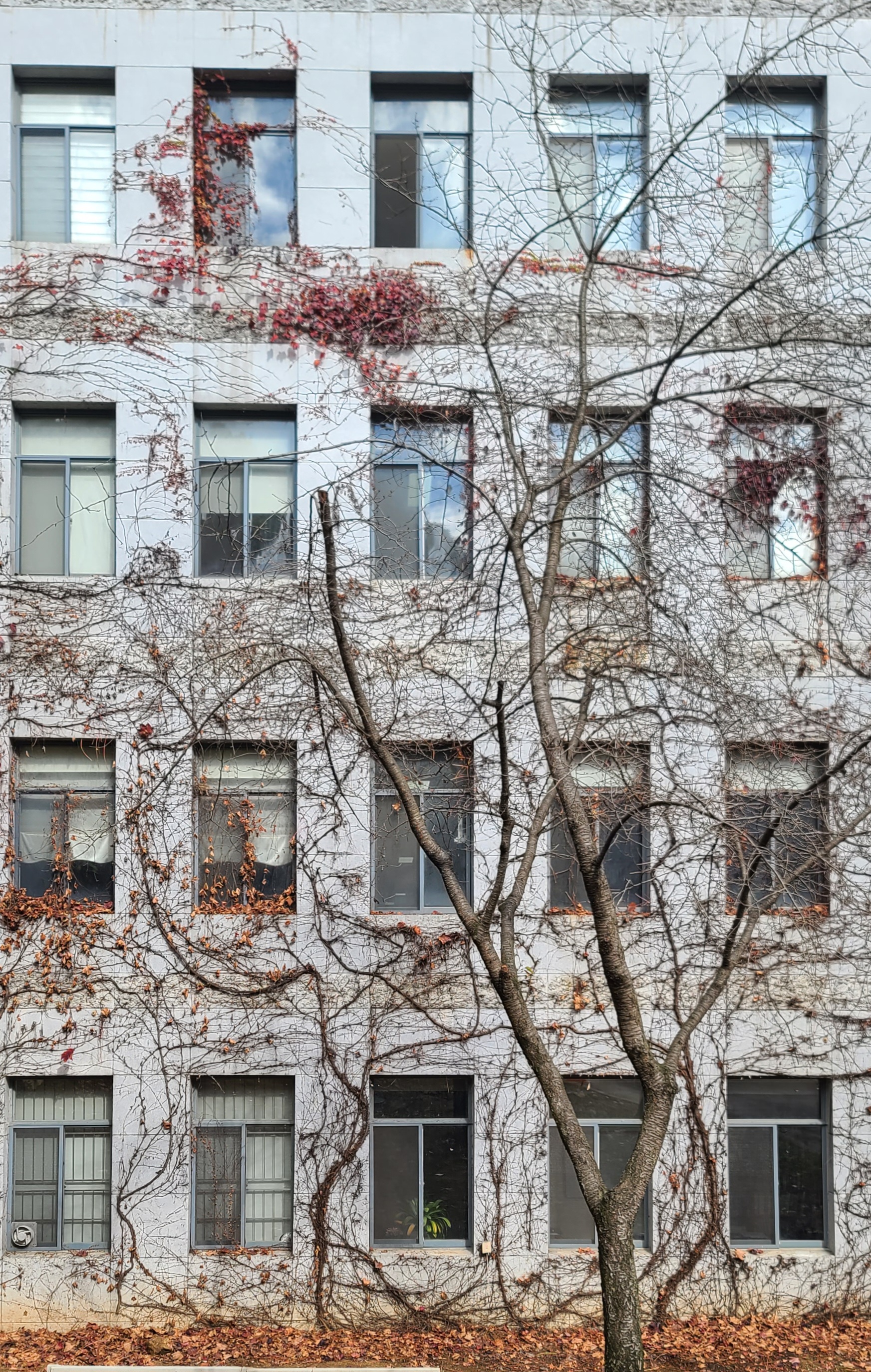 버티컬이 쳐진 창, 커튼이 없는 창, 화분이 있는 창, 커튼이 반만 쳐진 창, 브라인드가 쳐진 창, 열린 창, 우측의 낙엽을 거의 떨군 나무 한 그루와 평범한 창문에 담쟁이 덩쿨이 창문들 사이로 그림을 그려 놓은 탓에 마치 유서 깊은 건물처럼 보인다.