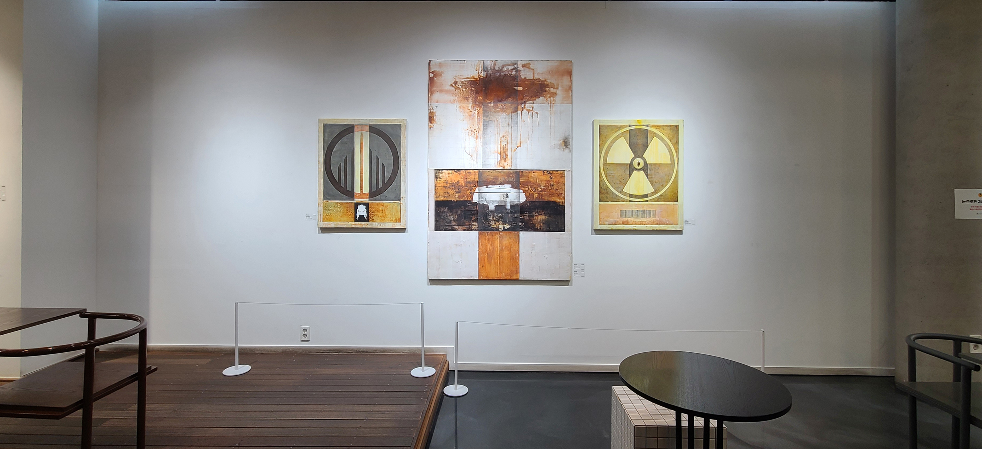 까페의 한 벽면을 채운 그림들. 세 점 모두 공통적으로 직사각의 수직 기둥을 세웠다. 그리고 그 다음에는 각기 다른 채색, 다른 표현을~