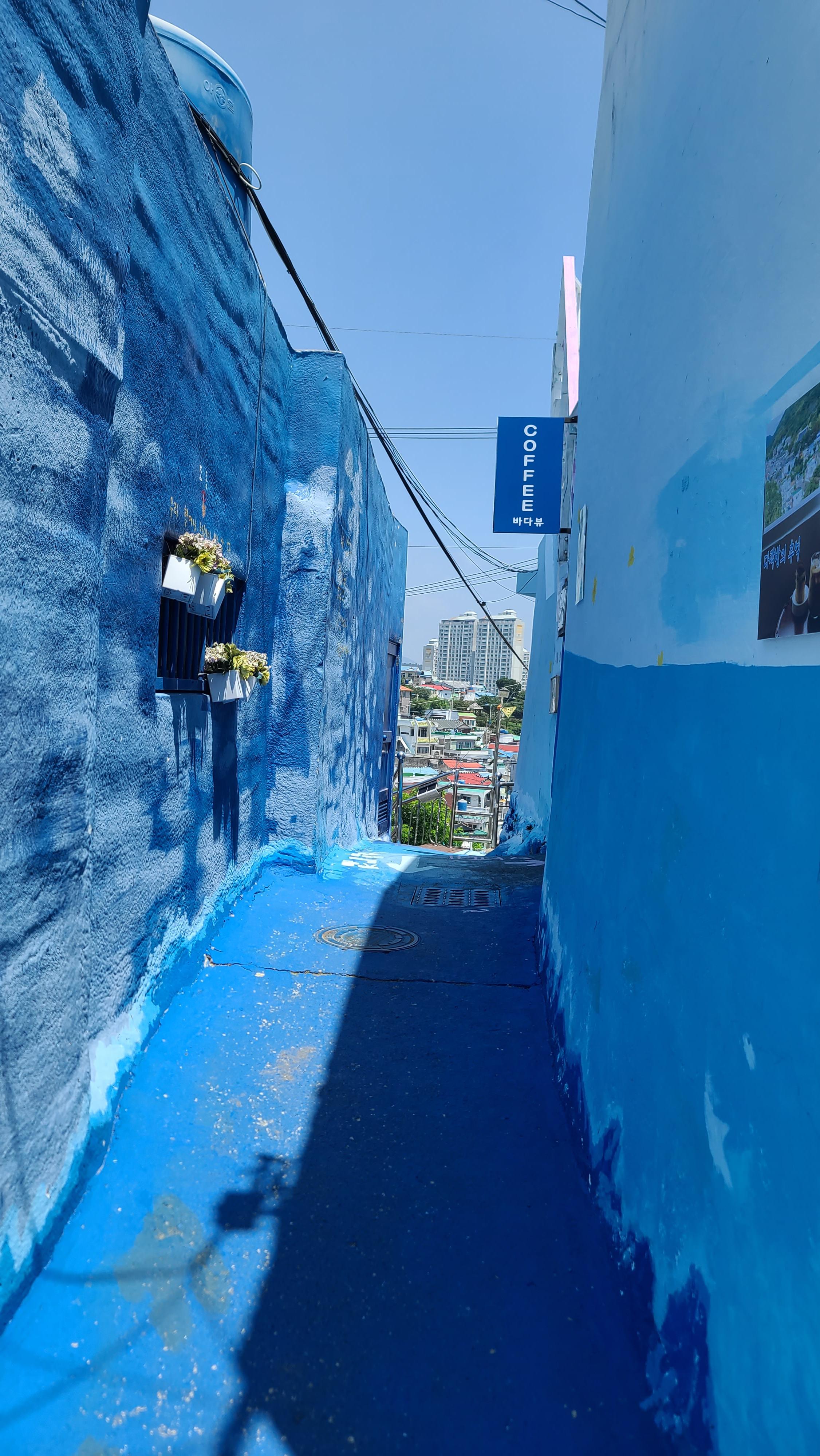 구불구불한 골목길을 따라 올라가니 마치 남해의 푸른 바닷속을 거니는 듯한 벽과 바닥과 하늘마저 온통 파랑색깔이 칠해진 골목길을 만나고는 골목길과 벽화가 너무 너무 아름답다. 커피샵 간판, 창문에 걸린 화분들이 더욱 운치를 더하고 골목길 사이로 보이는 풍경들이 낯설지 않다. 통영 동피랑 벽화 마을.