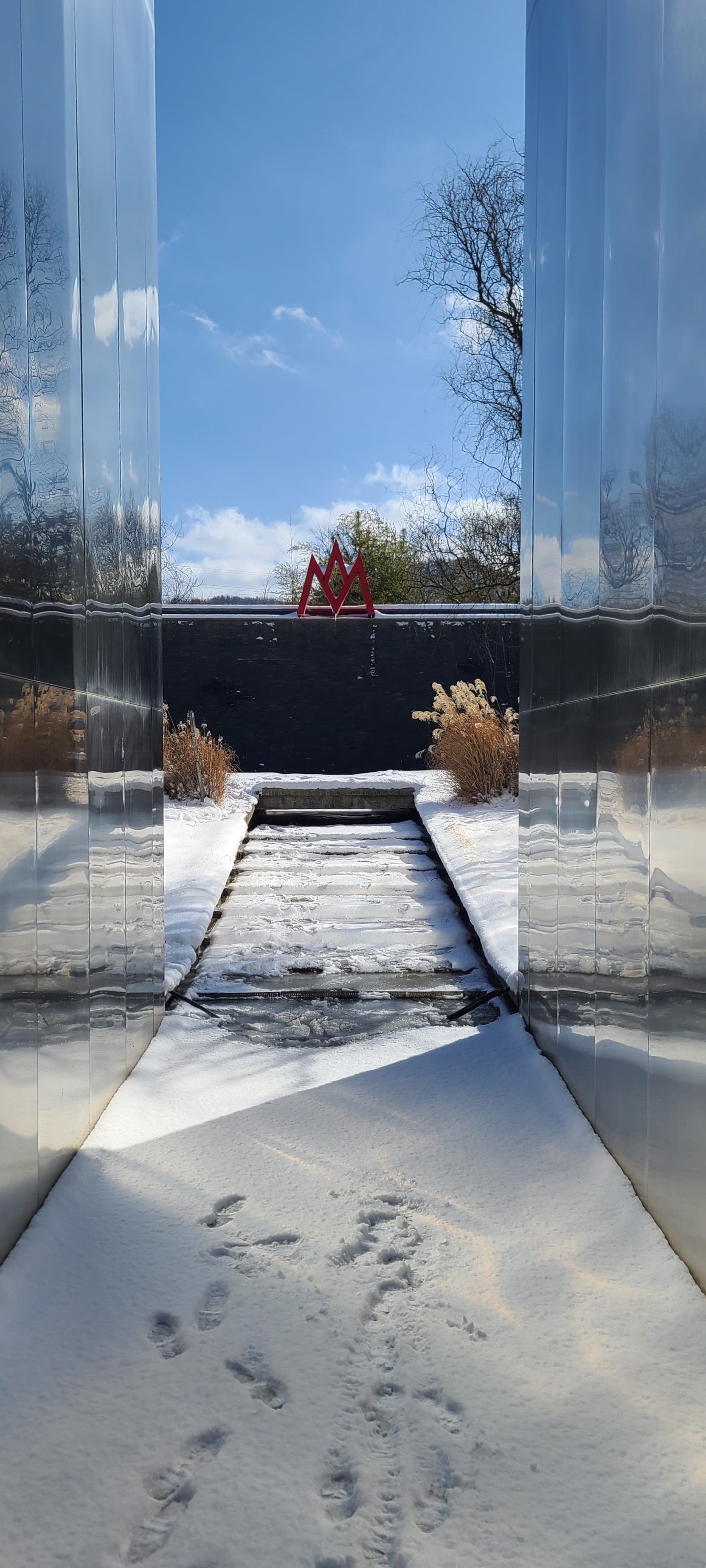 모나무르 정원, 흰눈이 내렸던 다음 날 건물과 건물 사이 가운데로 모나무르의 고유 로고가 보이고 건물 외벽에 얼비친 겨울 나무와 드넓은 하늘의 창이 열렸다.